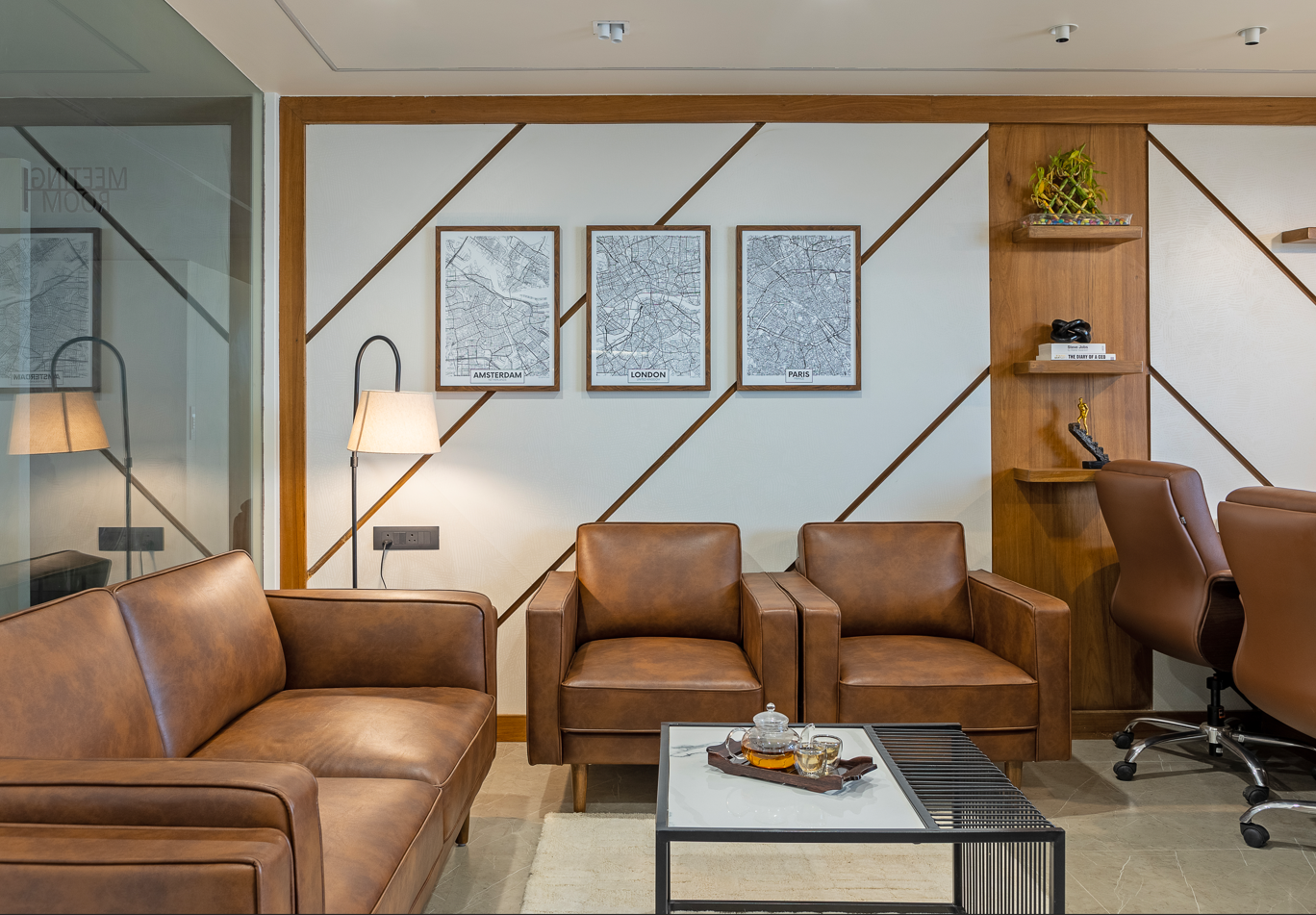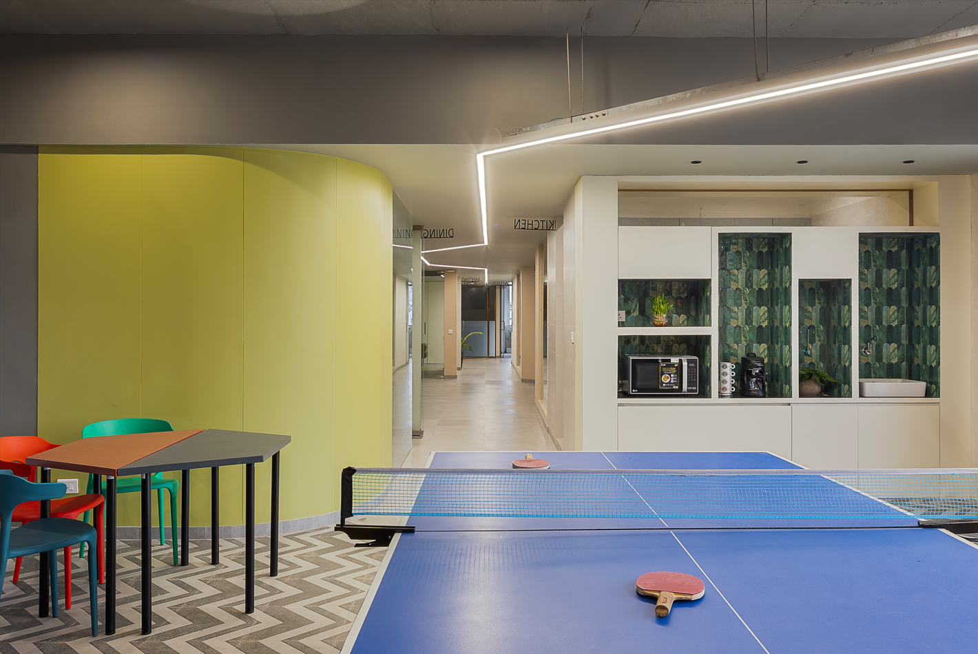 The 10m x 50m office space on the upper level, is organized into three distinct zones: the primary area with Director's offices, conference rooms, and studio space for guests; a staff area with department offices, storage, lockers, and washrooms; and finally, recreational zones strategically placed between these areas. The entire office area is a linear, narrow space, so the design incorporates a shifted circulation spine in tandem with a single profile ceiling light that opens up to two "breather" recreational spaces, adapting comfortable proportions and enhancing the visual dynamics within the space. The first recreational space, located just outside the Director's offices, offers guests a clear view of the sales floor while also enhancing air circulation throughout the shop floor. The second recreational space is equipped with modular and movable trapezoid furniture designed for maximum flexibility, allowing for various configurations to accommodate different meeting capacities. This space also includes an open breakout balcony, distinguished by its lively flooring and ceiling patterns, providing a refreshing contrast to the main office areas. The interiors are thus thoughtfully designed, with every detail serving a clear purpose, to create a space that is both highly functional and thoughtfully organized.